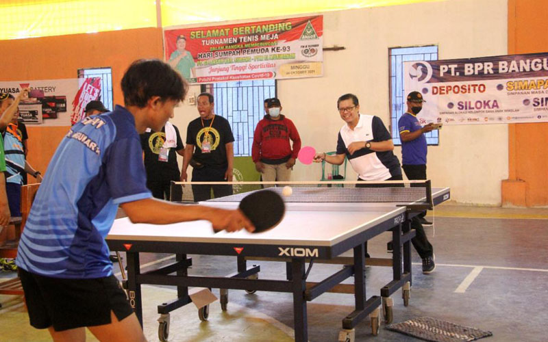 HWOARANGNEWS.ID | Wakil Bupati Subang Agus Masykur Rosyadi membuka turnamen tenis meja dalam rangka menyambut hari sumpah pemuda ke-93, GP Ansor Kabupaten Subang PTM Al-Muawanah menyelenggarakan turnamen tenis meja di Gor Peradaban Desa Mariuk Kecamtaan Tambakdahan. Minggu (24/10/21).