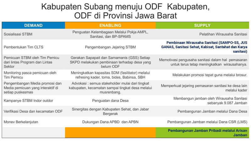 Dalam kesempatan tersebut Kang Jimat mengungkapkan rasa syukur atas tercapainya pilar kesatu yang telah meraih deklarasi Desa/Kelurahan ODF yaitu seluruh warga masyarakat di Kabupaten Subang sudah tidak buang air besar sembarangan, dengan tercapai kondisi sebagai Kabupaten ODF Kang Jimat berharap semoga derajat kesehatan masyarakat di Kabupaten Subang menjadi lebih baik, dan mengucapkan terima kasih sebesar-besarnya kepada seluruh pihak diantaranya kepada kader kesehatan, kepala desa, camat, kepala puskesmas, kepala perangkat daerah, forum kabupaten kota sehat, tim penggerak PKK dan seluruh masyarakat Subang sehingga seluruh desa/kelurahan di Kabupaten Subang mendapatkan predikat ODF pada tahun ini. "Tentunya setelah selesai pilar ke satu STBM ini status ODF harus dipertahankan dan kita upayakan mencapai semua pilar STBM lainnya" ujar Kang Jimat.
