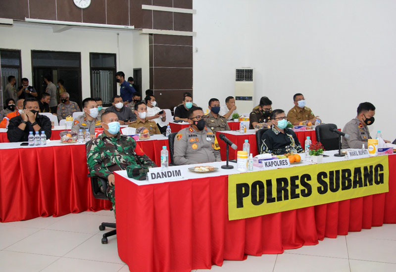 HWOARANGNEWS.ID | Wakil Bupati Subang Agus Masykur Rosyadi bersama Kapolres Subang AKBP Aries Kurniawan S.H mengikuti rapat koordinasi evaluasi PPKM seluruh indonesia dengan kementerian koordinasi perekonomian dan kementerian dalam negeri secara virtual di Aula Polres Subang, Senin 14 Juni 2021.