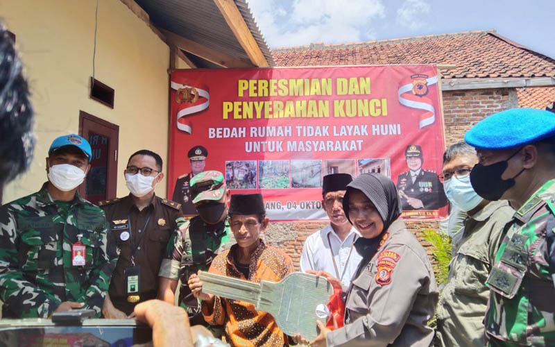 Kapolres Subang bersama Dandim 0605/Subang, Letkol Inf. Bambang Raditya meresmikan dan menyerahkan kunci rumah milik Karma yang telah selesai direnovasi tersebut.